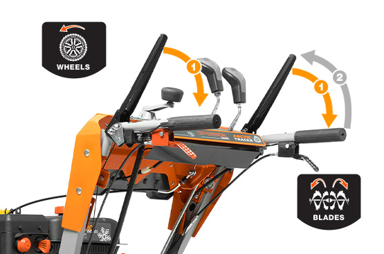 Нажатие 2-х рукояток приводит к их взаимной блокировке. Это позволяет управлять снегоуборщиком даже одной рукой, в том числе изменять направление выброса снега без остановки работы.