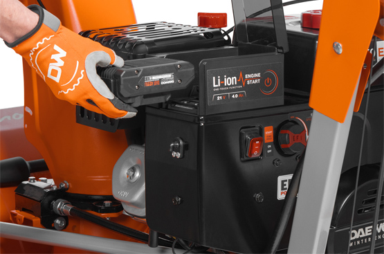 Благодаря установленному Li-ion акумулятору на 21В, двигатель запускается простым нажатием кнопки на рукоятке управления. Обеспечивает легкий запуск холодного двигателя при любых температурах до -30˚C.