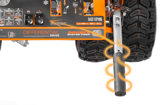 При зажатии обеих рукояток происходит их взаимная блокировка. Это позволяет управлять снегоуборщиком даже одной рукой, в том числе изменять направление выброса снега без остановки работы.